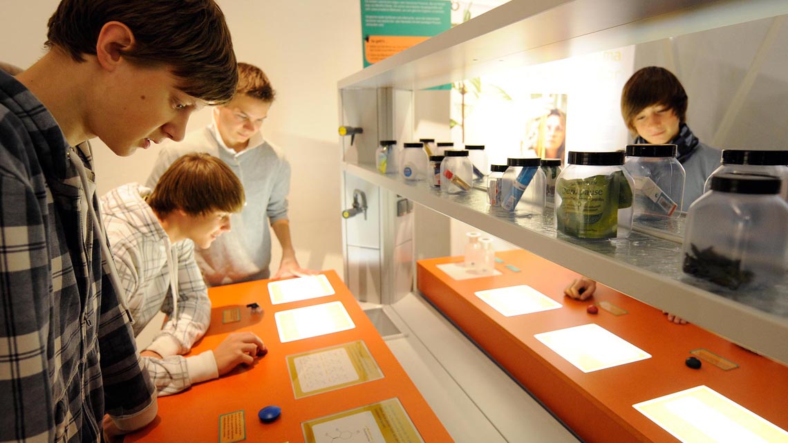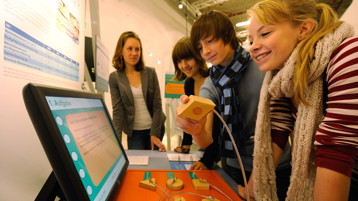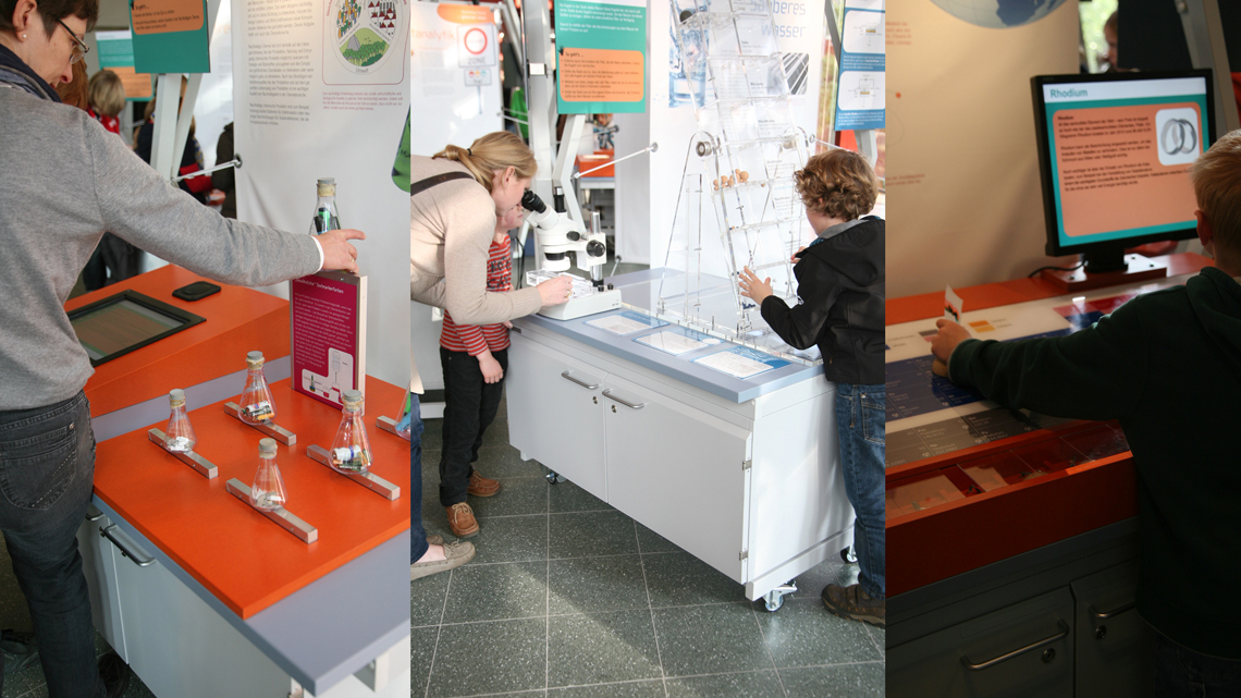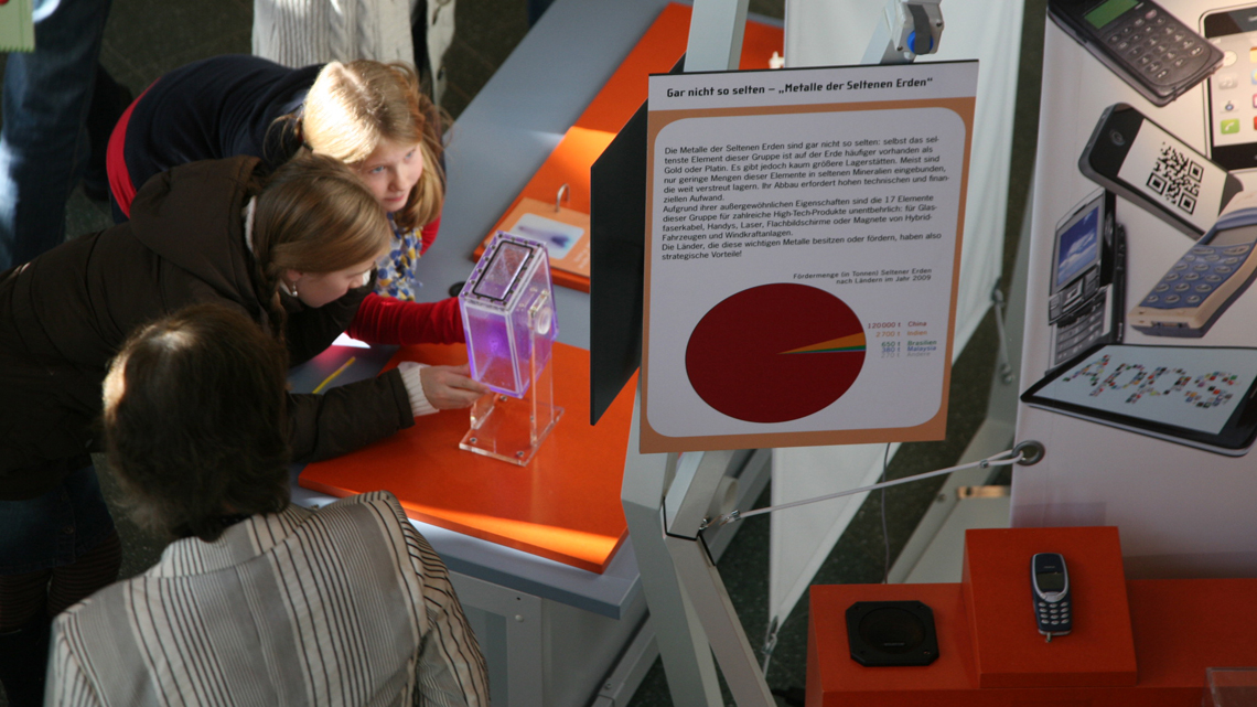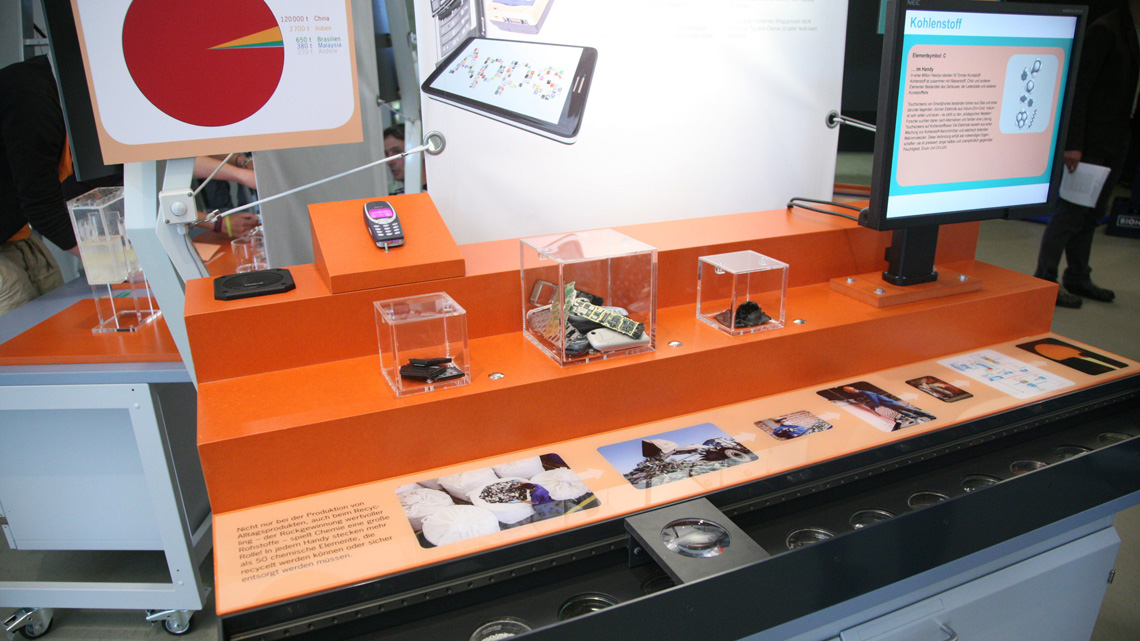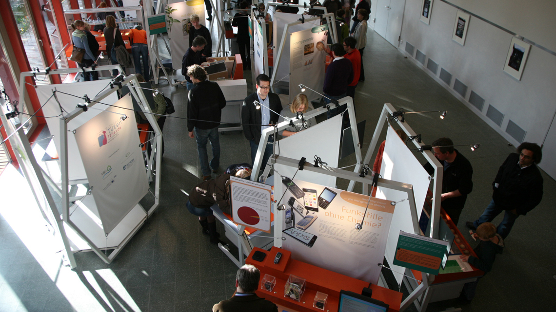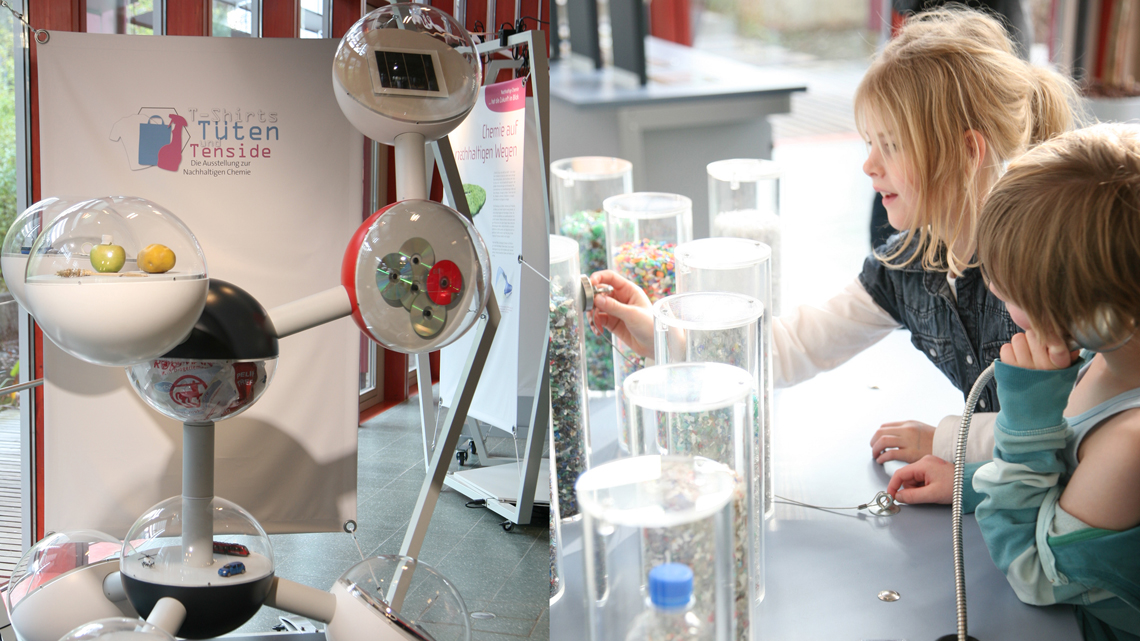 2011 war das Jahr der Chemie. Die Deutsche Bundesstiftung Umwelt (DBU) hat sich mit Partnern aus der Chemie (VCI, Dechema und GDCh) zusammengetan und uns mit der Entwicklung einer Wanderausstellung beauftragt. „T-Shirts, Tüten und Tenside“ eröffnet einen spielerischen Zugang zu nachhaltiger Chemie am Beispiel alltäglicher Produkte, wie z. B. dem Handy. Ziel der Ausstellung ist es auch, junge Leute für chemische Berufe zu begeistern.